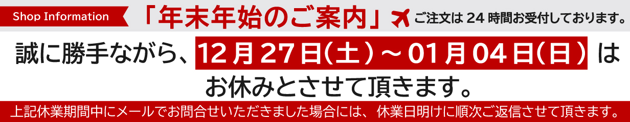 12月26日~ 1月5日までにご注文頂きました商品は、1月6日以降に発送の手配をいたします。